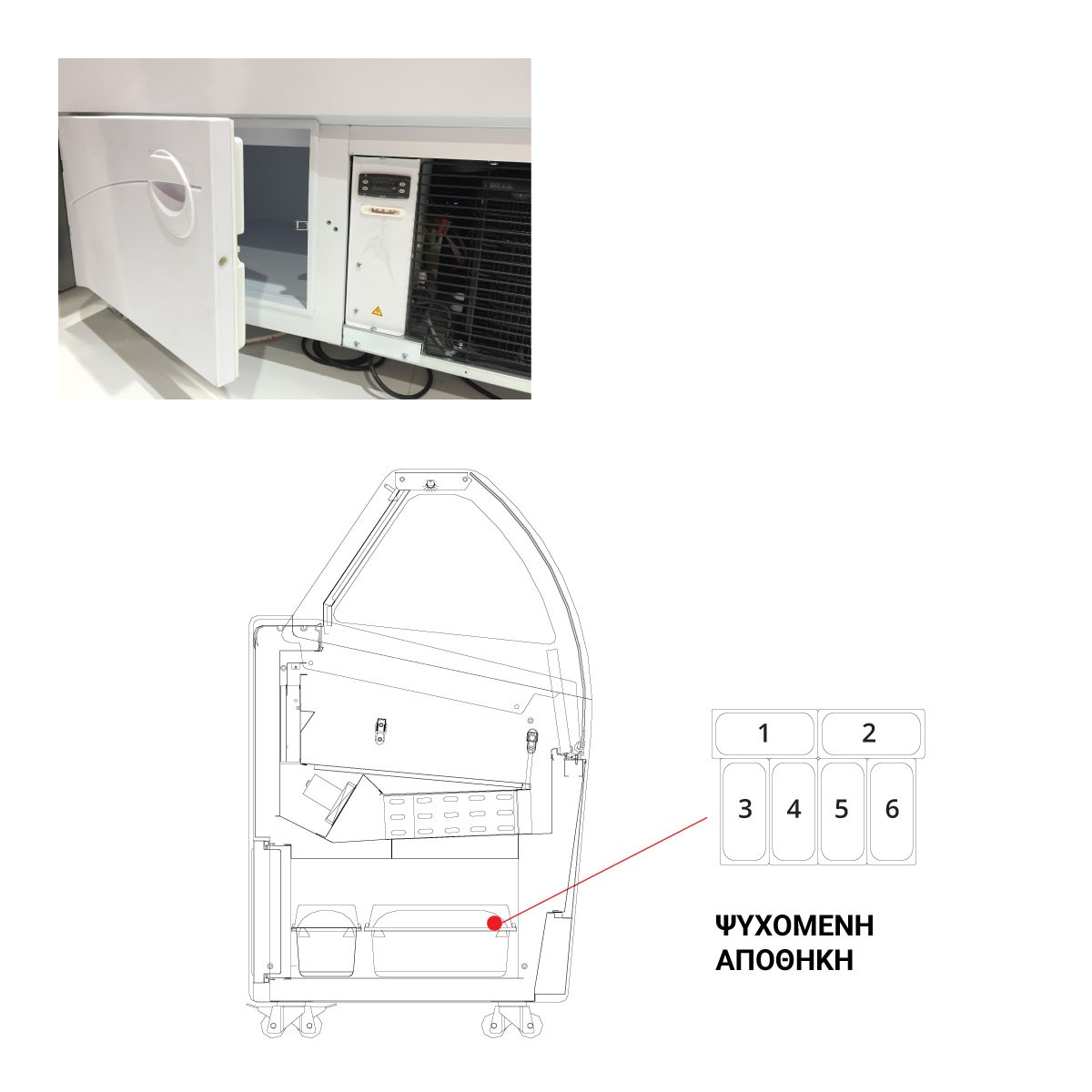Ψυγείο βιτρίνα παγωτού 13/14 θέσεων, CRYSTAL ELEGANTE 56, ελληνικής κατασκευής. Χωρ/τα: 540 λίτρα. Διαστάσεις: 1676x862x1263mm.