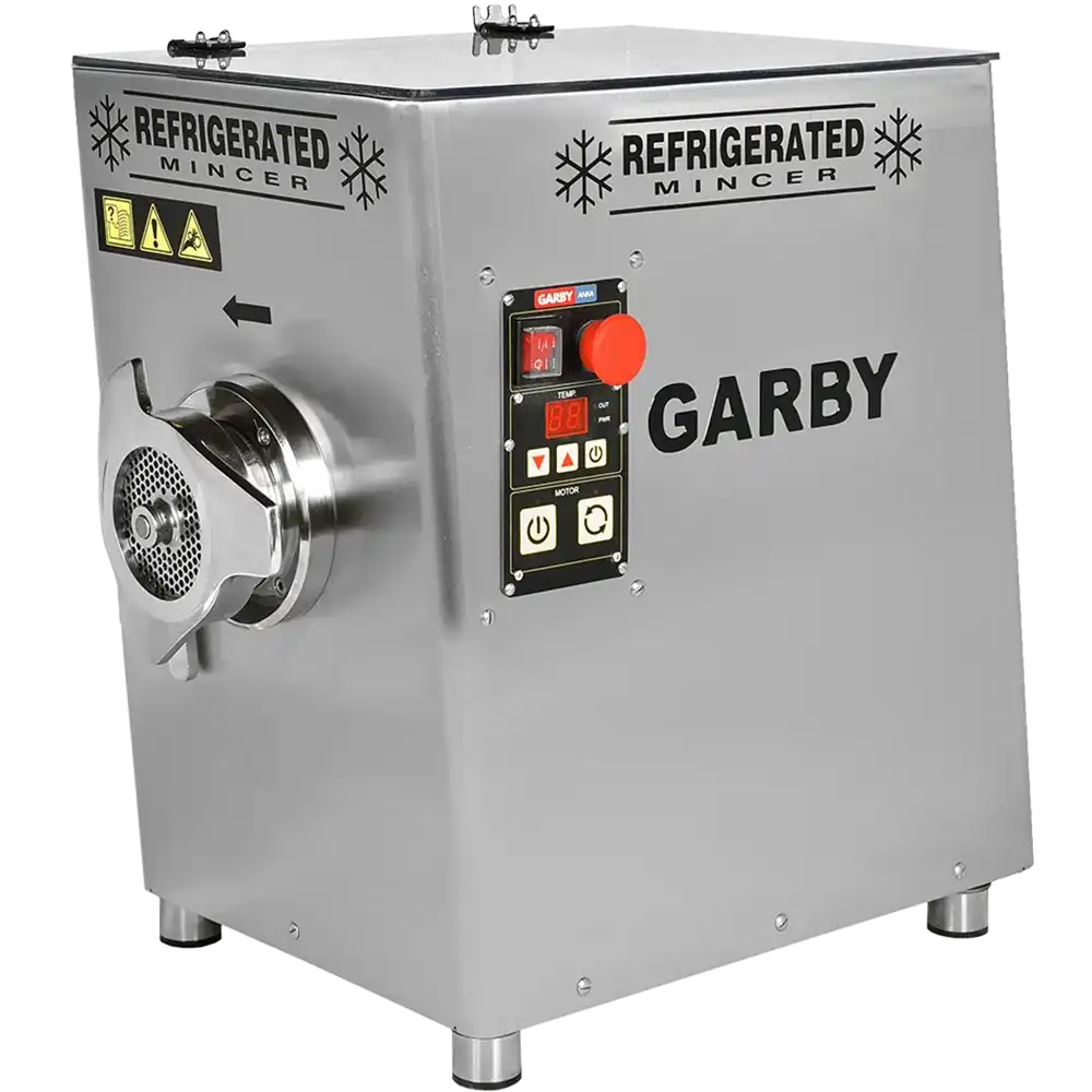 Κρεατομηχανή GARBY. Κατασκευασμένη εξ ολοκλήρου από ανοξείδωτο χάλυβα AISI 304 -18/10. Με μονοκόμματο καπάκι και ταψί και ψυκτικό κύκλωμα για τέλεια ψύξη στο ταψί και στην μπούκα διατηρώντας το κρέας σε άριστη κατάσταση.