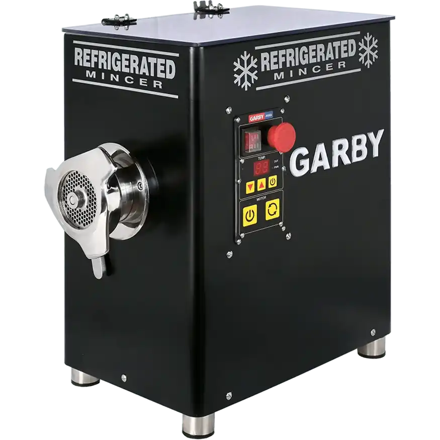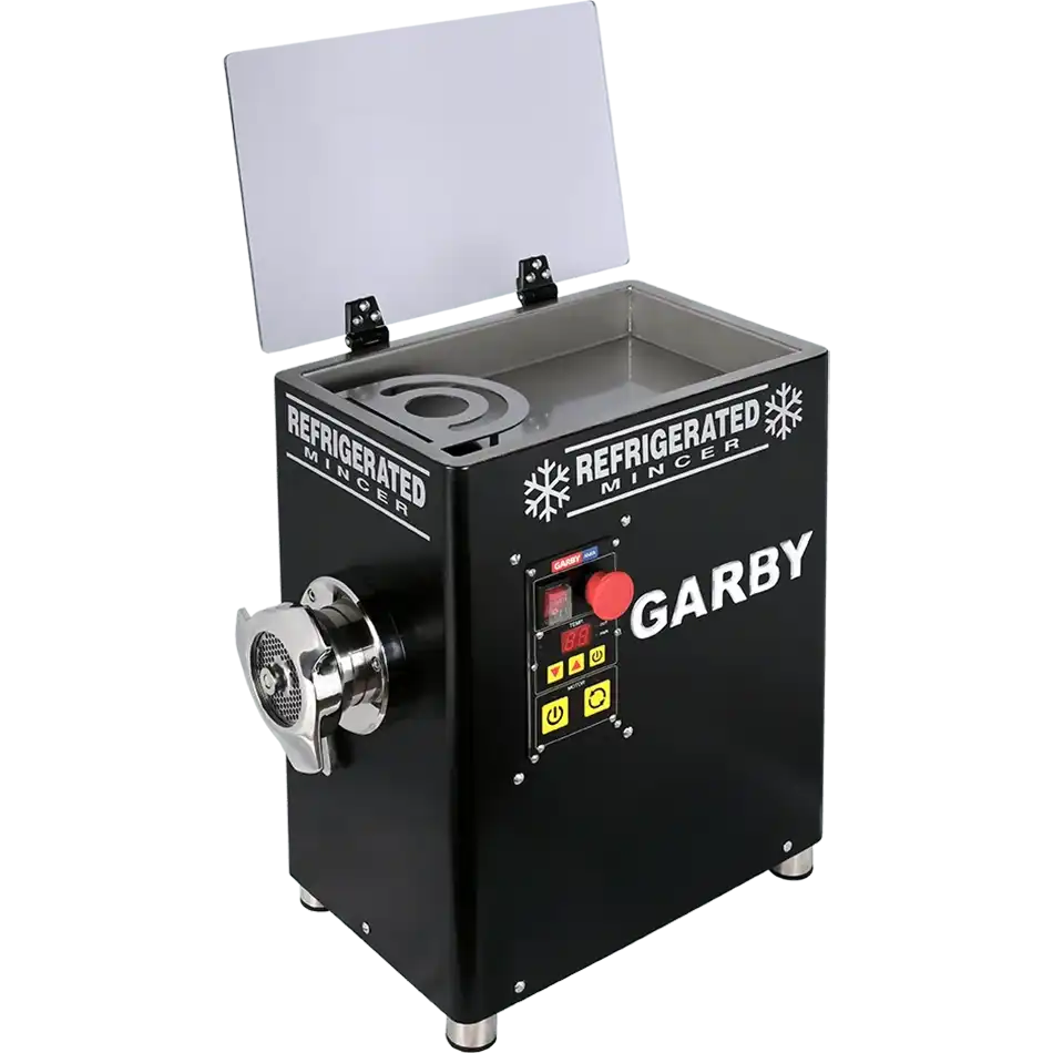 Κρεατομηχανή GARBY. Κατασκευασμένη εξ ολοκλήρου από ανοξείδωτο χάλυβα AISI 304 -18/10. Με μονοκόμματο καπάκι και ταψί και ψυκτικό κύκλωμα για τέλεια ψύξη στο ταψί και στην μπούκα διατηρώντας το κρέας σε άριστη κατάσταση.