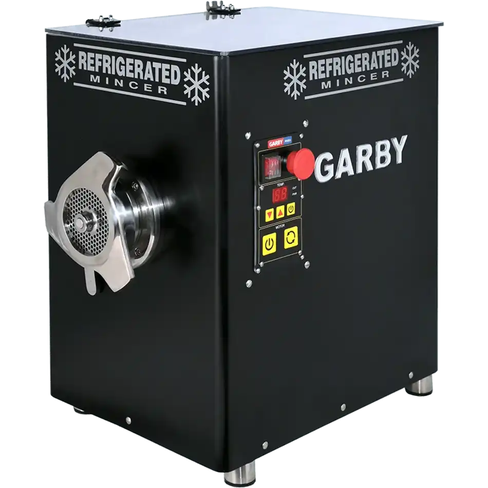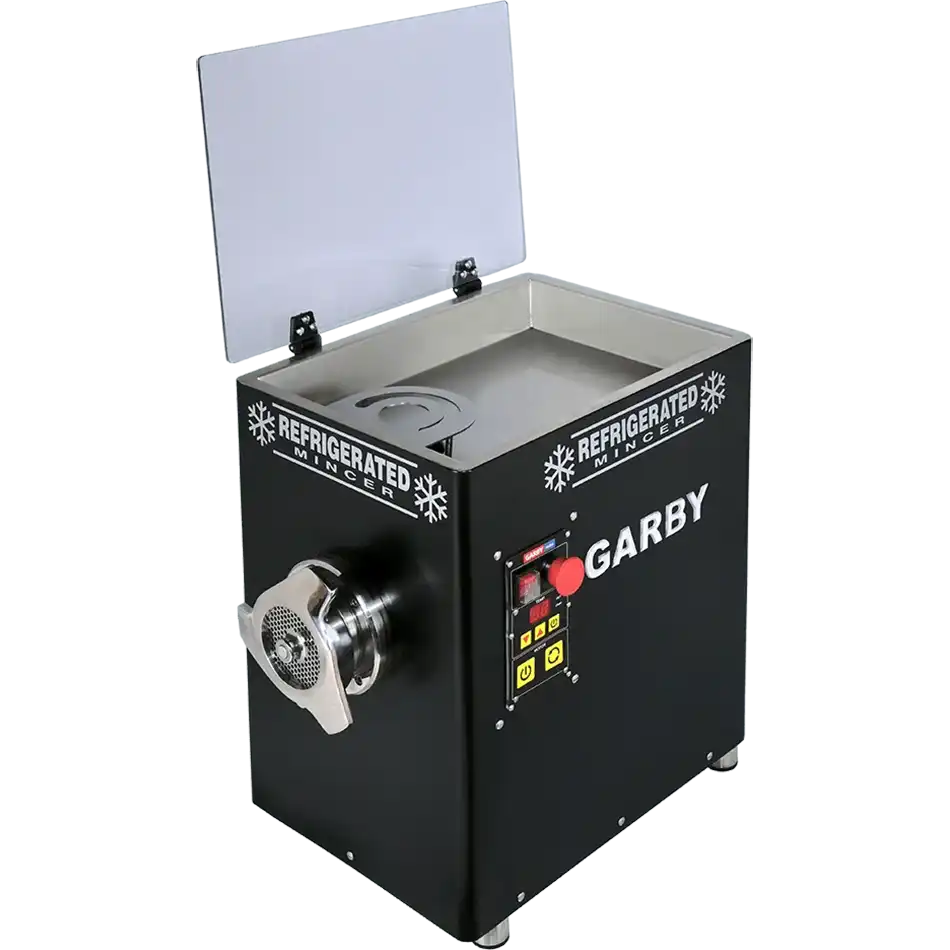 Κρεατομηχανή GARBY. Κατασκευασμένη εξ ολοκλήρου από ανοξείδωτο χάλυβα AISI 304 -18/10. Με μονοκόμματο καπάκι και ταψί και ψυκτικό κύκλωμα για τέλεια ψύξη στο ταψί και στην μπούκα διατηρώντας το κρέας σε άριστη κατάσταση.