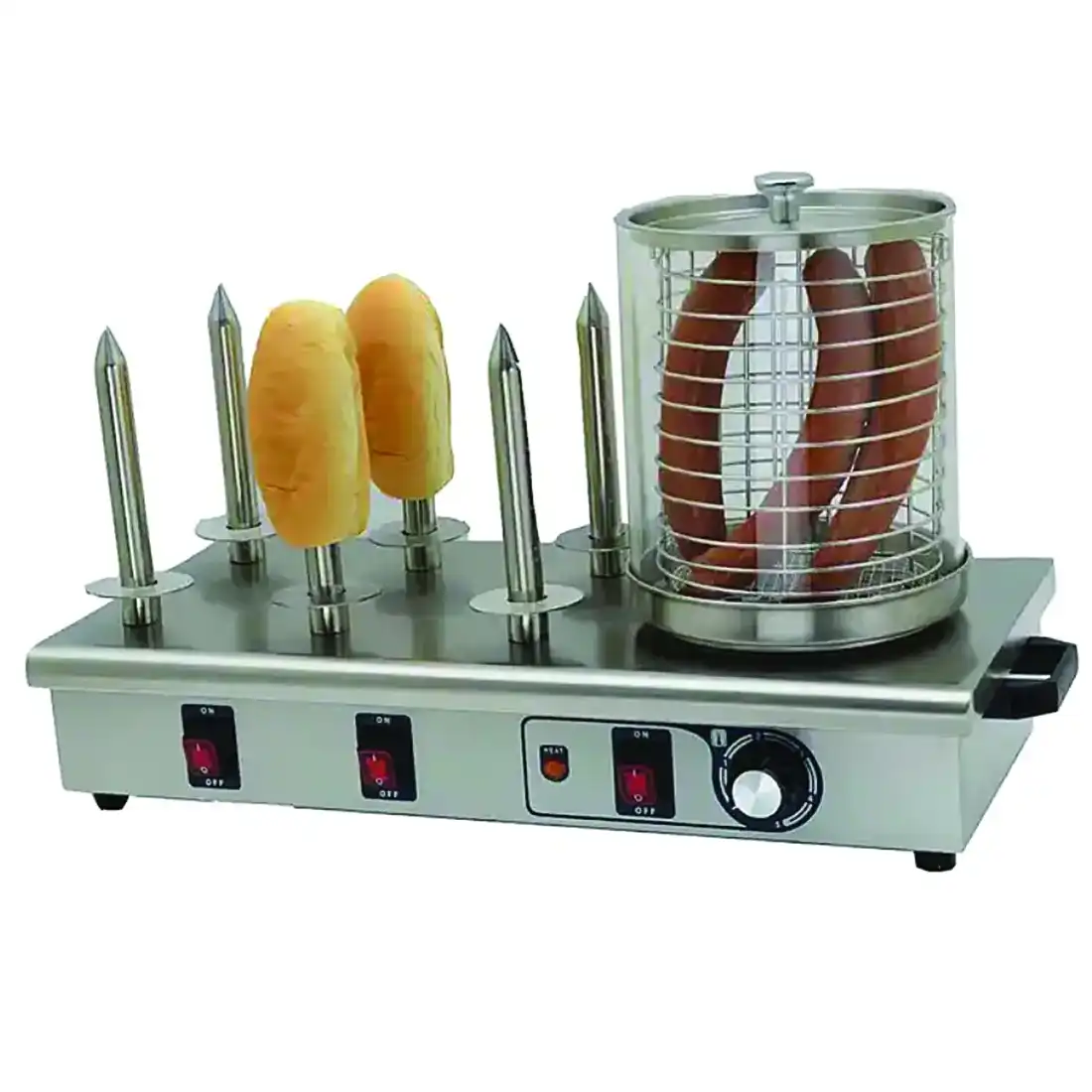 Μηχανή hot dog Karamco. Επιτραπέζια, ανοξείδωτη. Ηλεκτρικό μάτι ECO. Με διακόπτη ON/OFF και θερμοστάτη. Με 6 υποδοχές για τα ψωμάκια και γυάλινη κατσαρόλα.