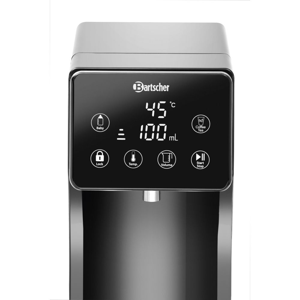 Βραστήρας νερού Bartscher. Ρύθμιση θερμοκρασίας σε 6 βαθμίδες (45ºC / 55ºC / 65ºC / 75ºC / 85ºC / 100ºC) + 2 πλήκτρα γρήγορης επιλογής (βρεφική τροφή : 40ºC & καφές / τσάι : 98ºC).